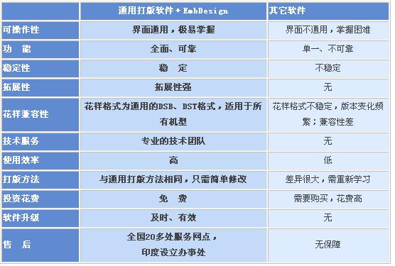 下表為簡易毛巾打版大豪解決方案–“通用打版軟件+EmbDesign”與市場上那些可以制作簡易毛巾花版的打版軟件(下表簡稱其它軟件)的功能對比: